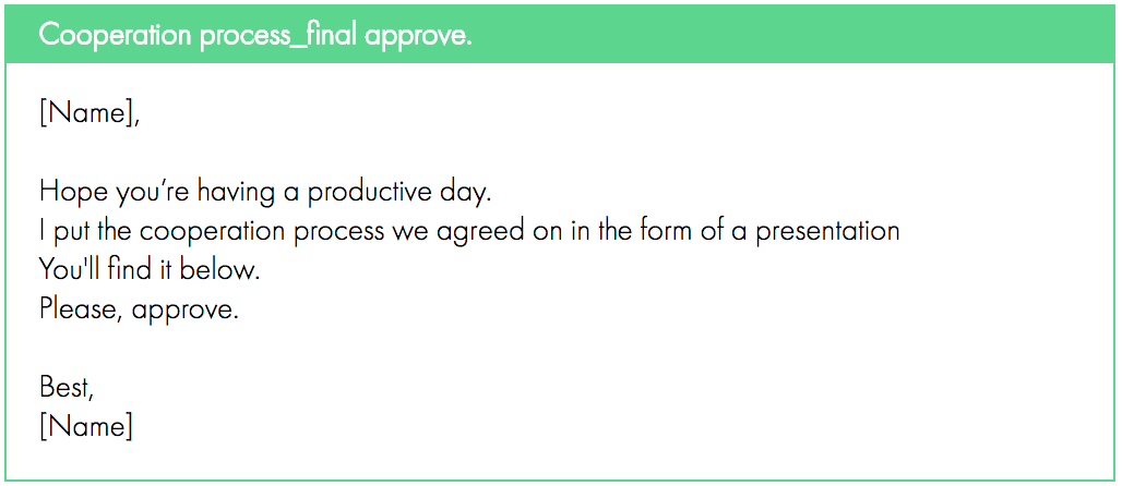 Please find the attached document for your signatory. First it sounds stuffy and overly formal. Just use direct language and drop the business lingo. Always add a context to the above format.